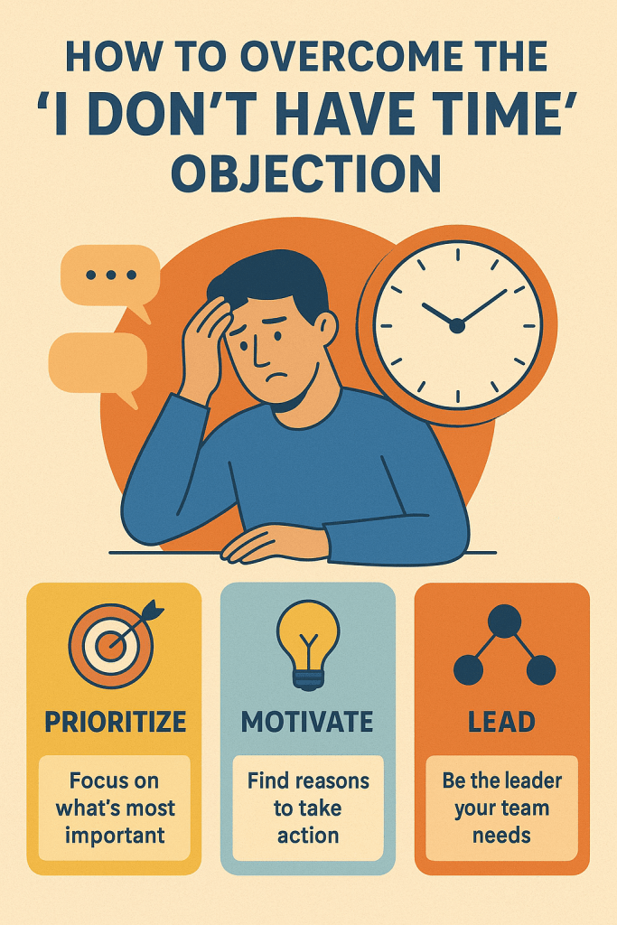 The “I don’t have time” objection isn’t about hours on the clock—it’s about priorities, leadership, and approach. If we focus on recognizing lazy leadership, inspiring motivation, and using the right first words, we can turn objections into opportunities.